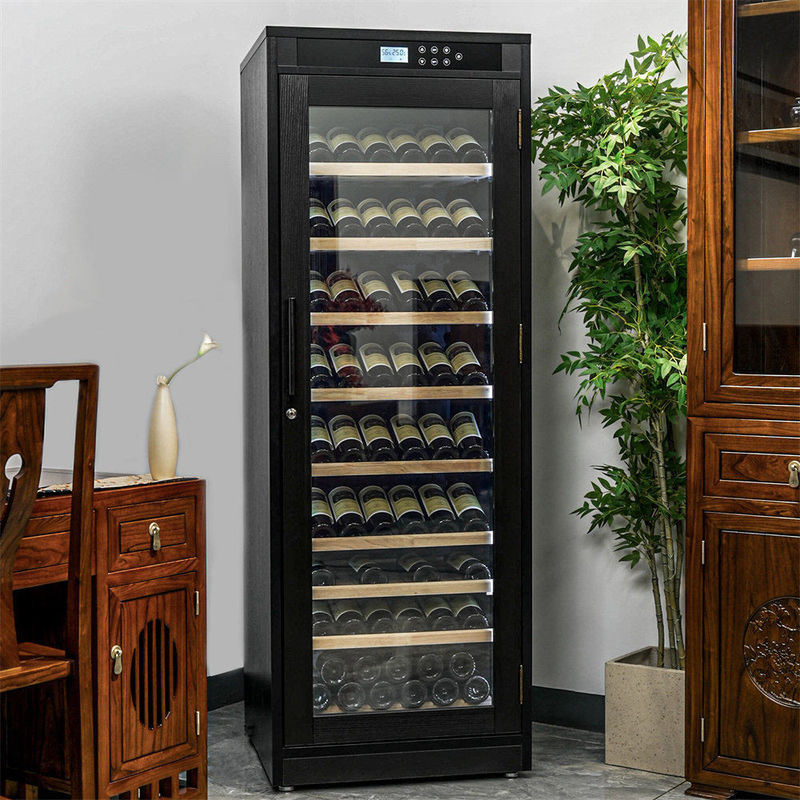 Disfruta de tu pasión por el vino con nuestro exquisito enfriador de madera negra controlado por temperatura inteligente, meticulosamente diseñado para la perfección.Este refrigerador de vino combina tecnología de última generación con elegancia atemporal., que ofrece a los amantes del vino la solución definitiva para almacenar y preservar sus preciosas colecciones de vinos.